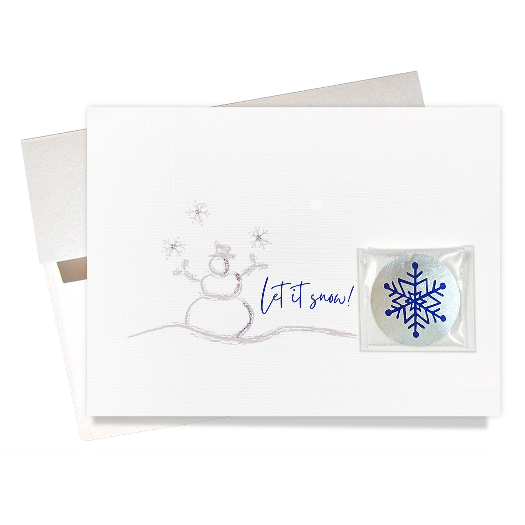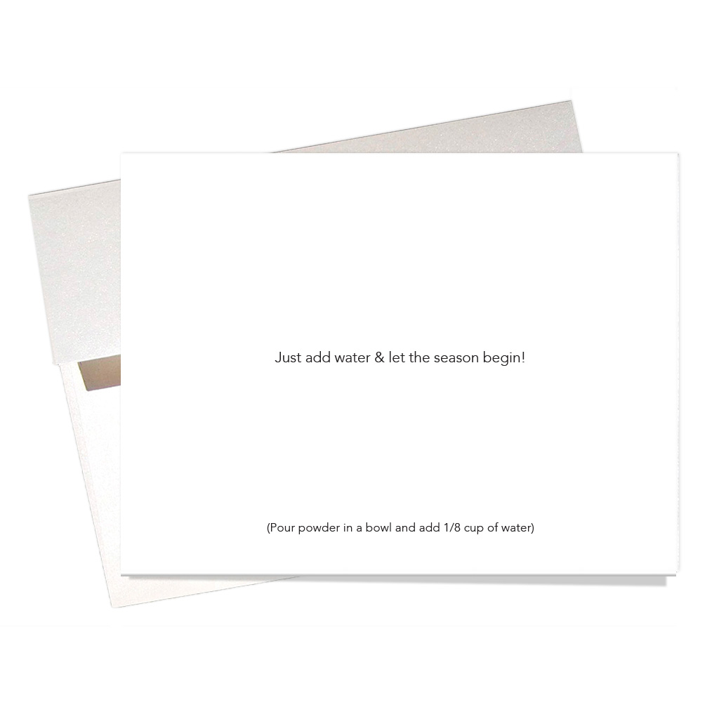 “Let It Snow!” Card lets you send the fun of “snow” in a greeting card! Just add water to powder from a little packet of Snow To Go! instant snow featured on the front of a card. Makes a surprising amount of cool, moist faux snow from just a bit of powder and water. Front of card says: “Let it snow!” Card says inside: “Just add water & let the season begin!”
