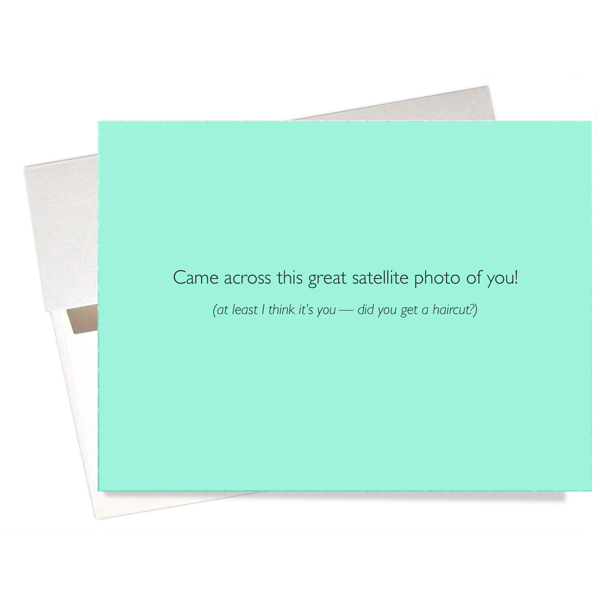 Our playfully humorous “Satellite Photo” Friendship Card features image of Earth seen from space with an arrow pointing to “You.” Inside says: “Came across this great satellite photo of you! (at least I think it’s you…did you get a haircut?)”